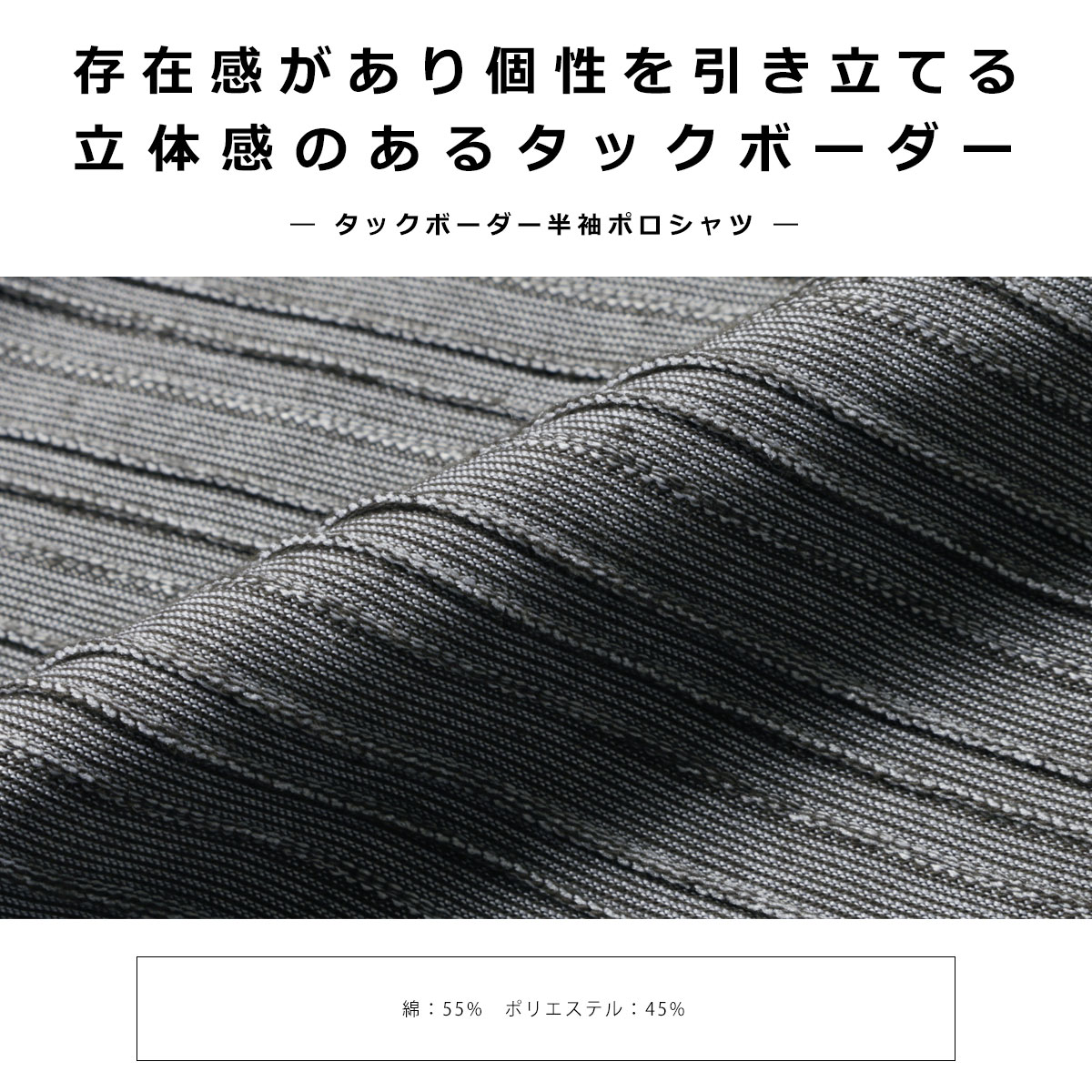 アイテムのポイント 生地をつまんでヒダを作り縫い合わせたタックでボーダー柄のデザインを施したポロシャツ。
